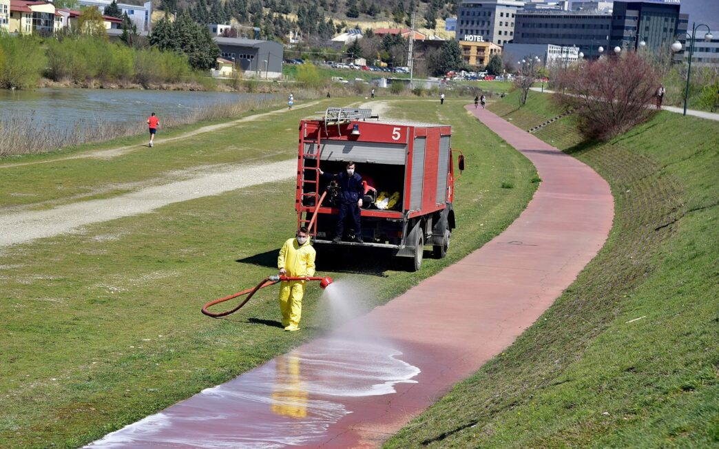 Екипите на Град Скопје и екипите на Противпожарната бригада на Скопје денеска спроведоа акција за миење и дезинфекција на кејот на реката Вардар. Миењето се реализираше со цистерни со специјално средство за дезинфекција на јавните површини, а се дезинфицираше и урбаната опрема.