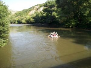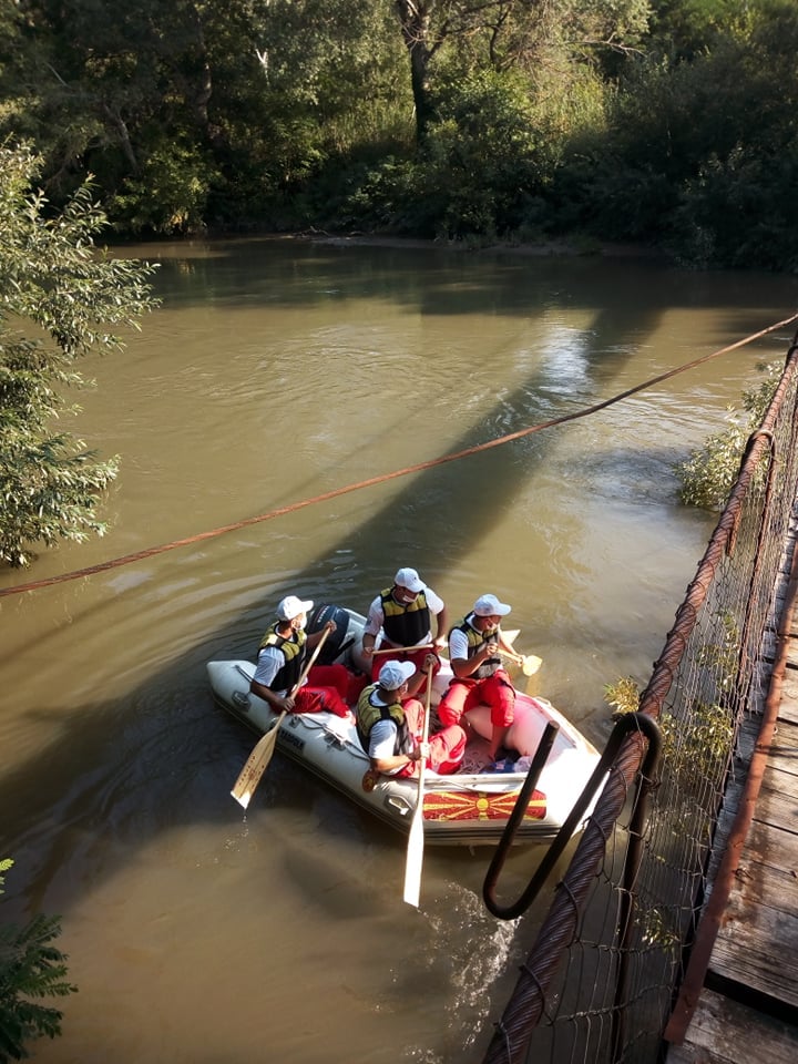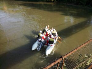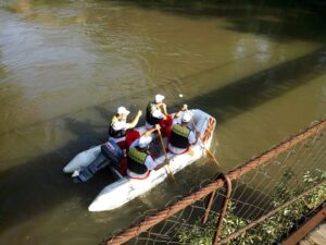 И покрај тоа што нивото на Вардар е многу високо за овој период од годината, сепак обуката и стручноста на волонтерите од Тимот за одговор при катастрофи дозволува тие да бидат дел од подрагата со еден гумен чамец.