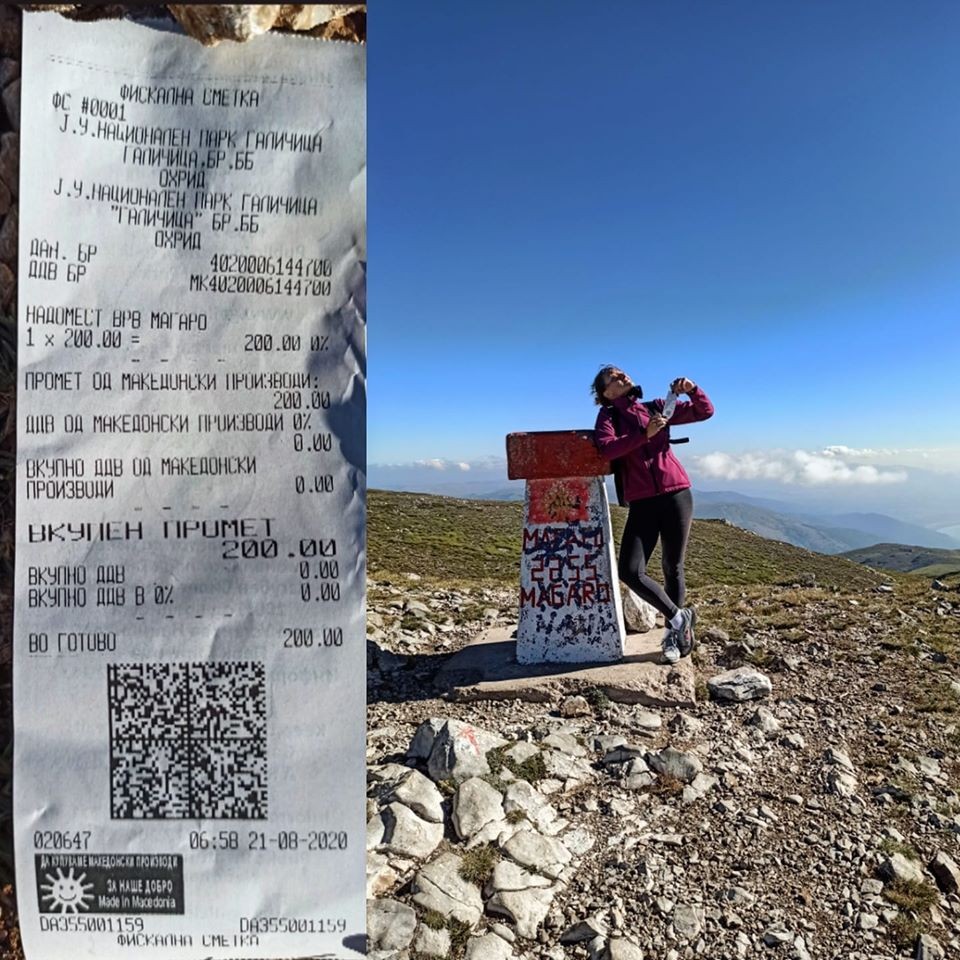 -Вчера наутро на местото кај што вообичаено се поаѓа кон највисоката точка на Галичица, врвот Магаро 2255 н.м.в, наместо со радост, екипно тргнавме со неколку стотки полесни и со многу чемер со себе. Млад дечко, вработен за плата и слушање наредби, излезе од кола спремен со фискален апарат и покрај нашите негодувања, кажа: Извинете, знам, не можам ништо да сторам, јас сум само вработен“ И со кренати раменици и свесен и усрамен дека прави компромис со своите морални и етички вредности, ни наплати по 200 денари од човек за искачување на врвот Магаро. Со услови дека ако немаме да платиме не смееме кон врвот, напиша Евгенија Здравевска на Фејсбук.