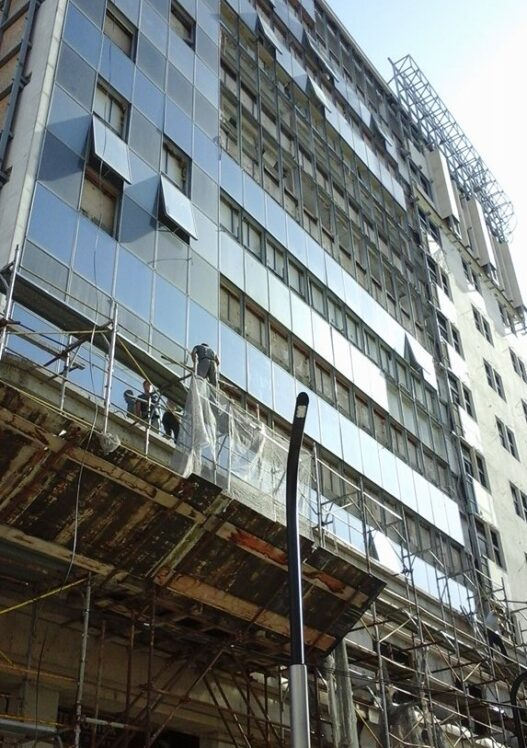 Градежните работници ги демонтираат скелињата околу висококатницата на ЕСМ кај Градскиот трговски центар кои со години стоеа околу неа по запирањето на изградбата на барокната фасада. Отстранувањето на скелињата откри дека дел од поранешната стаклено-метална фасада е веќе заменет со бетонски елементи, но и дека дел е се уште останат на зградата.