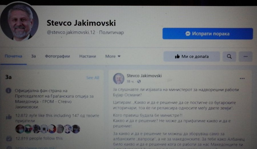 Неодамнешната изјава на министерот за надворешни работи Бујар Османи дека „Какво и да е решение да се постигне со бугарските историчари, тоа ќе ги релаксира односите меѓу двете земји“ е повод за реакцијата на Стевче Јакимовски, лидер на опозициската партија ГРОМ. Објавата на неговата Фејсбук страница ја пренесуваме во целост: