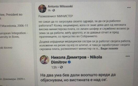 – Колку лицемерно, кога се знае дека дел од неговата висока министерска плата, со личен шофер и службено возило ја зема за да работи, меѓу другото, и за давање отчет и пред пратениците, со присуство во Собранието. Додека илјадници медицински сестри си ја работат својата работа, изложени на ризик од кој се штитат, и така ја заработуваат својата скромна плата, размазениот министер ги потценува со оправдание дека не сакал да дојде да одговори на две прашања во Собранието. Срамота! Додека илјадници касиерки во самопослуги, новинари, аптекари, келнери, заболекари и службеници се присутни на работа, изложени на ризик од кој се штитат, и така ја заработуваат својата плата, министерот кој зема пет пати повисока плата од нив, не можел да дојде до Собрание на еден час и да им објасни на пратениците што преговарал со Бугарија?!, напиша Милошоски.
