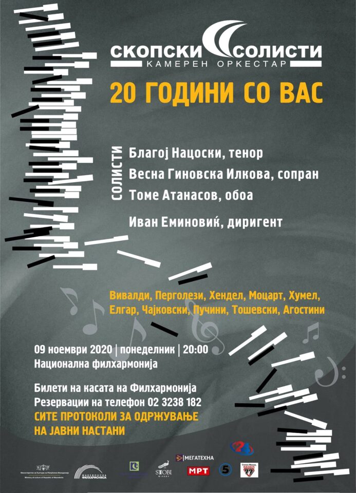 На 9 ноември камерниот оркестар „Скопски солисти“ ве кани на јубилеен концерт во Македонската филхармонија, со почеток во 20 часот. Меѓу солистите кои ќе настапуваат се Весна Гиновска Илкова и Благој Нацовски. Оркестарот го предводи познатиот македонски обоист Васил Атанасов.