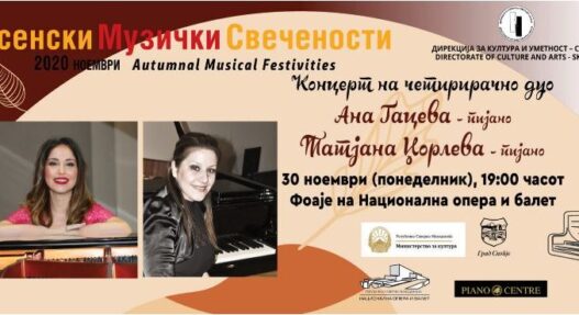 Пијанистките Ана Гацева и Татјана Џорлева вечерва одржуваат четирирачно дуо на пијано во фоајето на МОБ. На репертоарот се дела од А. Дворжак, Ј. Новак и Е. Григ. Концертот се одржува во рамки на манифестацијата „Есенски музички свечености“.