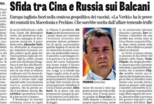 Нови конфузии околу набавката на кинеските вакцини што ја правеше македонската Влада се појавија денеска по пишувањето на италијанскиот весник „Ла верита“. Овој весник, познат кај нас по објавувањето на разни материјали врзани за случувањата во Македонија, во текстот насловен како „Битка помеѓу Кина и Русија за Балканот“ објави дека кулминацијата со лошото менаџирање и набавувањето на вакцини од страна на македонското државно раководство се случила со Кина.