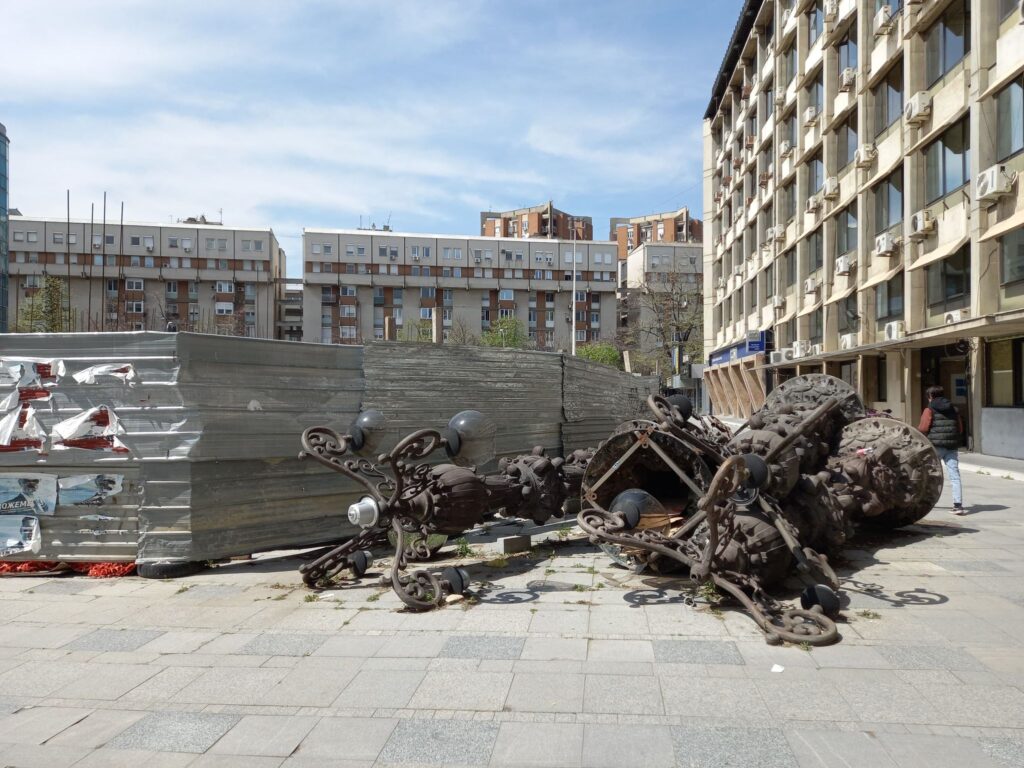 Од едната страна може да ѕирнете зад полутворените тараби (исклучително опасен дел) и да видите една огромна, ама навистина огромна дупка. Од другата страна пак, ќе видите неколку легнати канделабри, масивни, со жици кои висат од сите страни.
