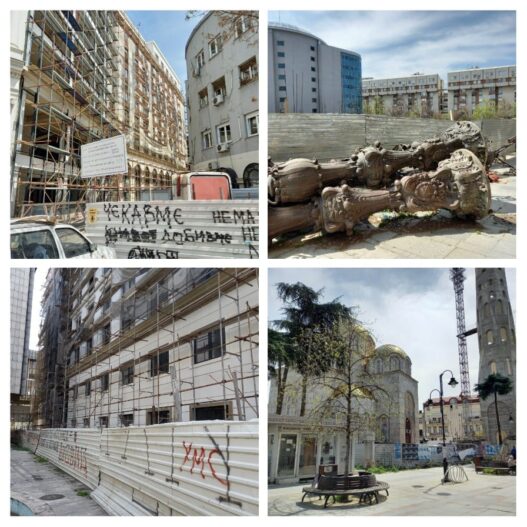 Но, исто така секој кој живее во Скопје барем еднаш неделно (ако не и почесто) поминал нив центарот на градот, низ улицата „Македонија“ во делот покрај спомен -куќата на Мајка Тереза, кон Музејот на Град Скопје. И веднаш од левата страна ќе види тараби, кои над една деценија не се помрднати. Зад нив ѕирка црквата Свети Константин и Елена, која исто толку се гради, а во дворот и и камбанаријата која зјае како обична бетонска кула.