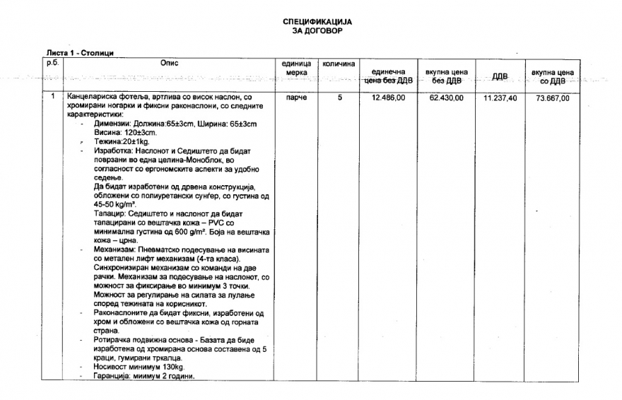 Првиот се однесува на набавка на столици и истиот е склучен на вредост од околу 50 илјади евра. Цената на една столица се движи од 3200 денари, а најскапата достигнува цена поголема од 200 евра.