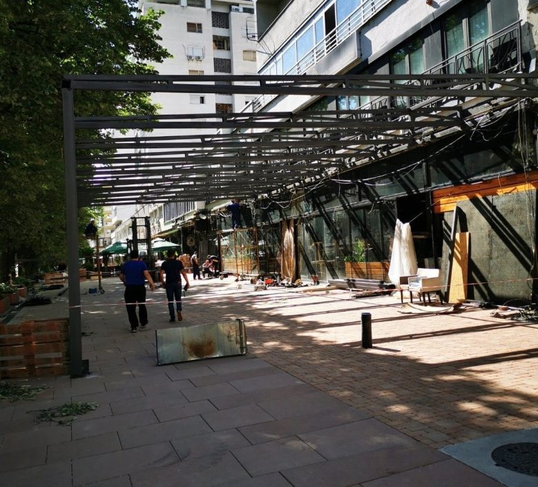Прашањето упатено до градските власти, се чека од таму објаснување. Инаку, познато е, во периодот кога скопскиот градоначалник Петре Шилегов договараше дислокација на угостителски тераси за да може да се изврши реконструкцијата, првично беше договорено дека угостителите на располагање ќе имаат простор на плочникот широк два метра. Потоа, се постигна договор таа површина наменета за кафеаните да биде широка 3,5 метри. Но, не беше наведено дали тоа подразбира горе да бидат поставени и метални конструкции и колку тие можат да бидат широки? На што ќе личи кејот ако сите угостители постават вакви или различни конструкции не е тешко да се претпостави.