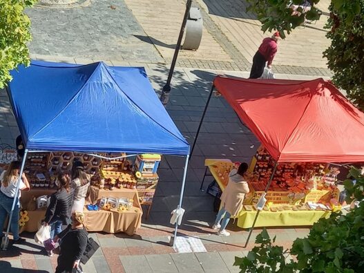 На штандовите поставени долж улицата „Македонија” во центарот на Скопје, посетителите имаат можност да дегустираат и да купат различни видови мед, полен, восок и други производи од наши македонски пчелари.