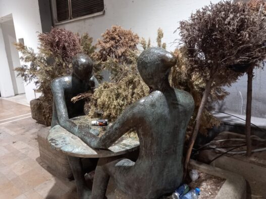 На Кејот беа поставени неколку такви бронзени дела: Излет, На кафе… Ако се прашувате што е со нив, за едната имаме сигурен одговор: Ене ја во еден од премините на ГТЦ поставена покрај еден влез, „седнати“ на жардињери со исушено цвеќе и наоколу со отпадоци.