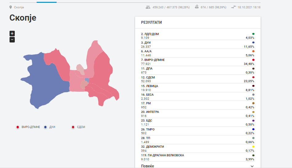 Од обработени 98,39 отсто од гласовите, според првичните податоци на ДИК, на вчерашните локални избори за Совет на Град Скопје ВМРО-ДПМНЕ освои 77.921 гласа, втор е СДСМ со 52.093 гласа, трета е ДУИ со 26.337 гласа, Левица со 19.910 гласа, Алијанса на Албанците/Алтернатива со 11.446 гласа, ЛДП/ДОМ со 9.190 гласа и Зелен Хуман Град 9.010 гласа. Останатите се едвај над 1 отсто и под тоа.