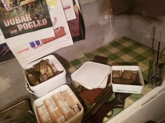 При претрес на дом и помошни простории кај А.Ј., каде што била лоцирана импровизирана работилница за изработка и поправка на оружје и муниција, биле пронајдени 6 ловни пушки, 3.215 парчиња муниција за огнено оружје, 67 механизми и делови од огнено оружје за пушки, 3 цевки за пушки, 74 делови од разновидно оружје, 9 затварачи за пушки, 22 кутии со разновидни механизми за пиштоли, една дигитална вага за мерење на барут, соопшти МВР.