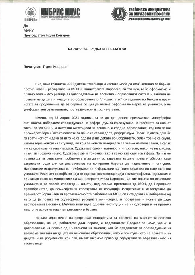 -Испративме и известување до премиерот Зоран Заев за незаконското работење на МОН, со сите докази и побаравме од него да ја повика на одговорност ресорната министерка, а побаравме и истата да даде неотповиклива оставка. Меѓутоа, ниту една од овие институции не ни одговори и не презема ништо по однос на нашите преставки и барања, се вели во писмото на „Либрис плус“ до Коцарев.